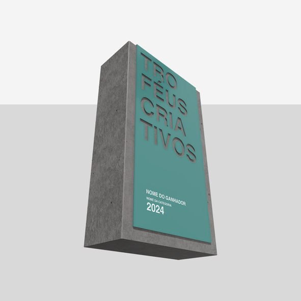 Materiais: troféu produzido em concreto, utilizando um molde criado por impressão 3D. Após a fabricação, a peça recebe acabamento com pintura, gravação UV e/ou acrílico, além da aplicação de EVA na base.